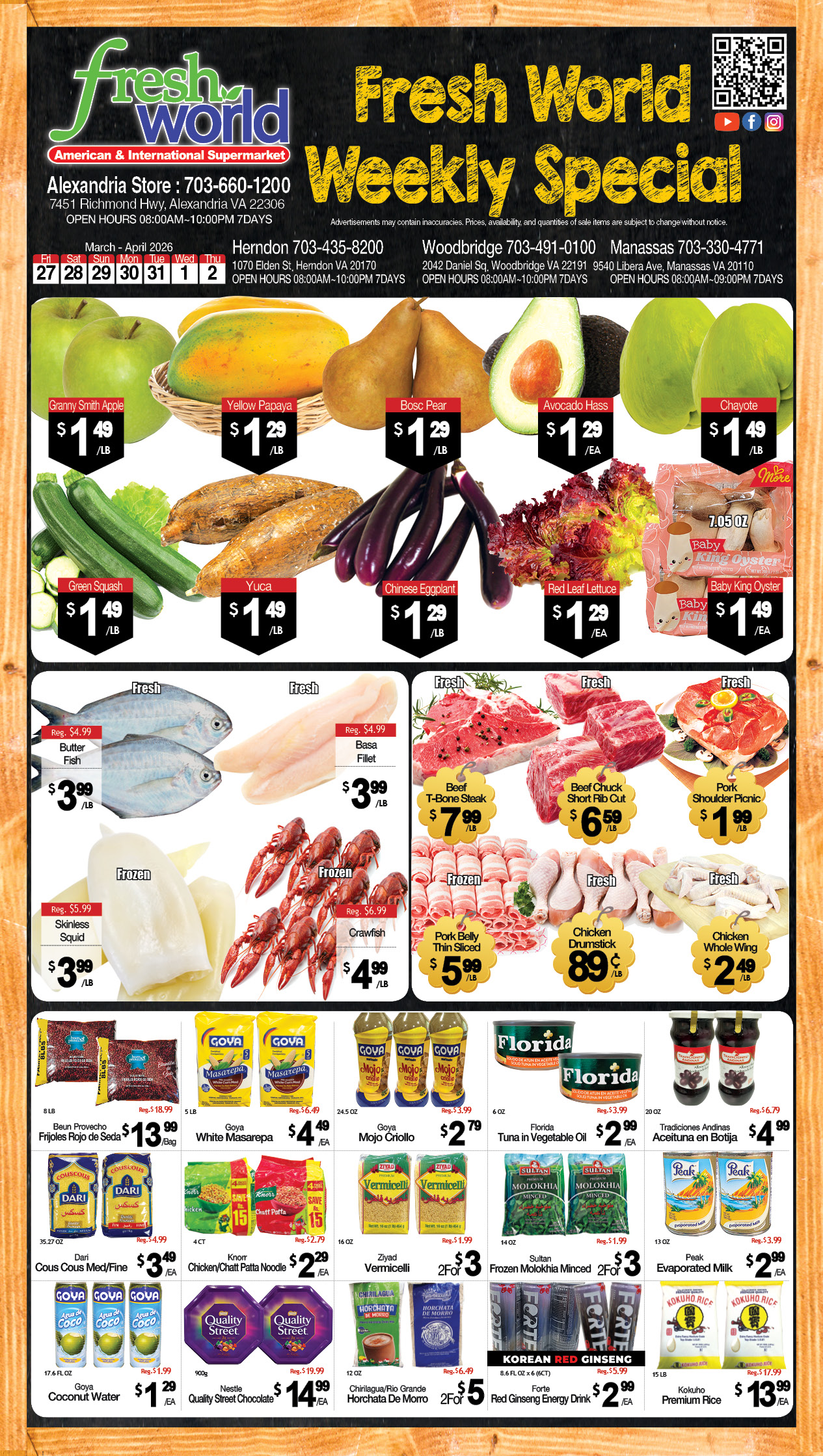 Each week, Fresh World posts its weekly newspaper ad online so that all of our customers can access it and start taking advantage of big savings. To view this week's ad, click on the link icon. It will open in a new window. When you're through, close the new window to return here.